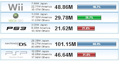Por otro lado también podéis ver que PlayStation 3 vende poco en E.E. U.U. al igual que también vende poco Microsoft en Japón. Y que Sony es la gran perdedora de esta generación, por ahora.