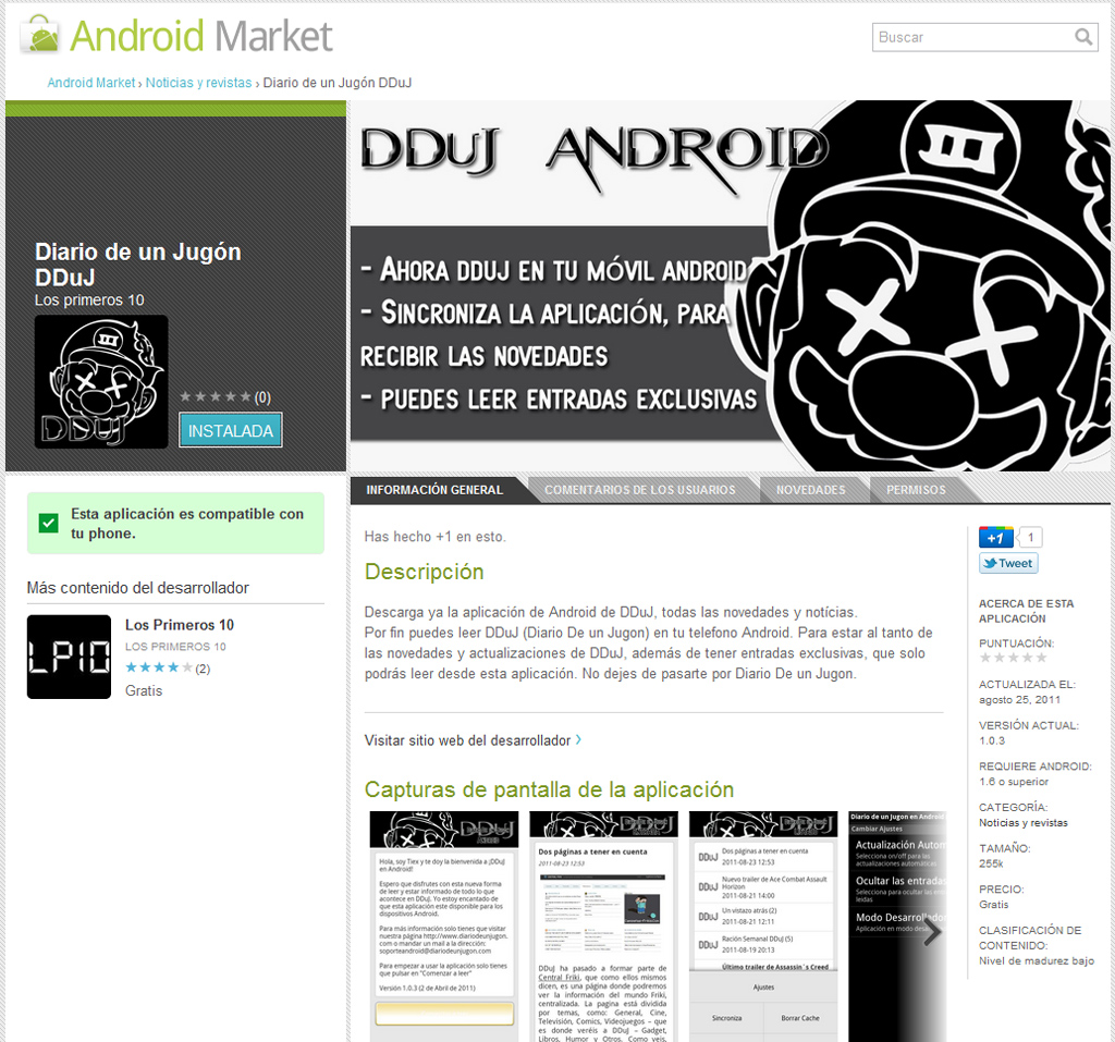Si quereis descargar la aplicación, solo teneis que pulsar en el enlace que teneis a continuación, aunque tambien tendréis disponible el banner en el mismo sitio que estaba situado el anterior y podeis hacer una busqueda en el propio Android Market, con las palabras: «DDuJ» o «Diario De un Jugon»