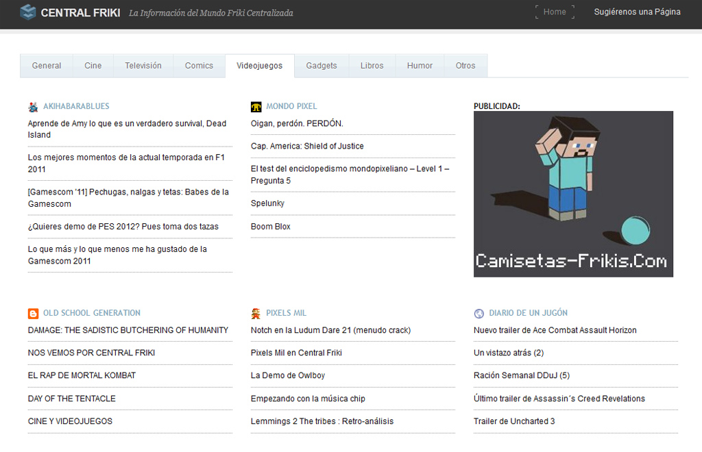 Si tenéis una página o blog, podéis entrar a formar parte de Central Friki, sugiriéndoles vuestra pagina – como yo he hecho y otros tantos – En la sección videojuegos, por ejemplo, os vais a encontrar con paginas como Old School Generation, Game Over, Pixel Mil, Tentáculo Purpura, Mondo Pixel, entre muchas otras – que no necesitan tanta publicidad por aquí –