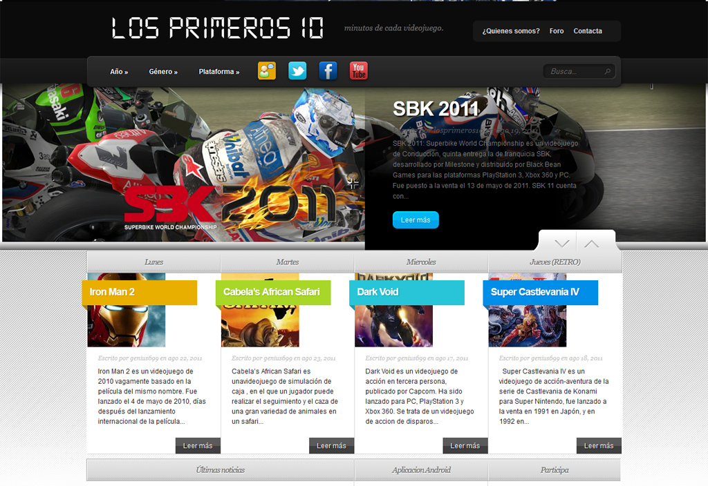 Pues es lo que vais a encontrar en Los Primeros 10 – LP10 – en su página oficial, tenéis los primeros 10 minutos de muchos juegos. Tanto juegos modernos recién salidos, como juegos que ya podéis encontrar en el mercado o juegos retro, que salieron hace tiempo ya. Tienen un orden de publicación semanal, dejando los miércoles para los juegos retro y los viernes para las novedades. Publican cinco videos semanales – que no están nada mal – y también tenéis su canal de Youtube si os queréis suscribir – yo lo he hecho 😀 –
