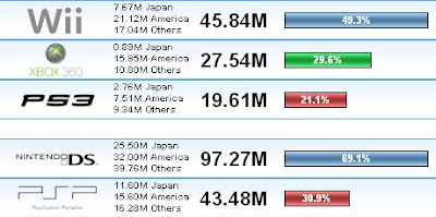 Ya que os he comentado antes la cantidad de PlayStation 2 que se habían vendido hasta ahora en Estados Unidos, aquí tenéis un cálculo aproximado del Ranking de ventas de consolas de cada continente y el total mundial de la actual generación de consolas. Salta a la vista la mala posición que tiene Sony y su PlayStation 3. Vendiendo algo mas de 8 millones menos que su actual competidora Xbox 360.