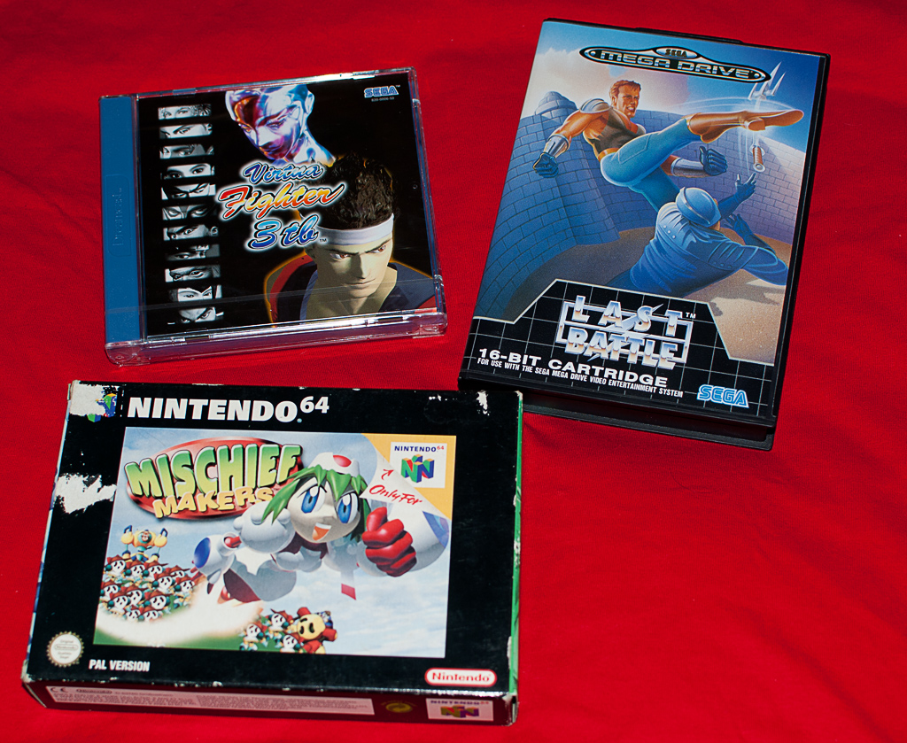 Como no tambien ha habido tiempo para comprar alguna cosa interesante – siempre pico con alguna cosa – destacando el Mischief Makers de Nintendo 64, que es una versión Alemana, pero tiene su caja y manual. Para los que no lo conozcáis, se trata de un juego desarrollado por Treasure para la consola de Nintendo, muy divertido y jugable. Ha caído un Virtual Fighter 3 de Dreamcast – ¡precintado! – , que llevaba mucho tiempo detrás de el – es un juego que nunca compre para mi Dremcast y no me preguntéis porque – y el odiado por muchos, en parte se entiende, Last Battle de Megadrive, también totalmente nuevo y sin estrenar. Este juego es una especie de version del juego japones, Hokuto no Ken (El puño de la estrella del norte) que se adaptó y cambio todo lo que se relacionara con el mismo manga, por problemas de licencia.