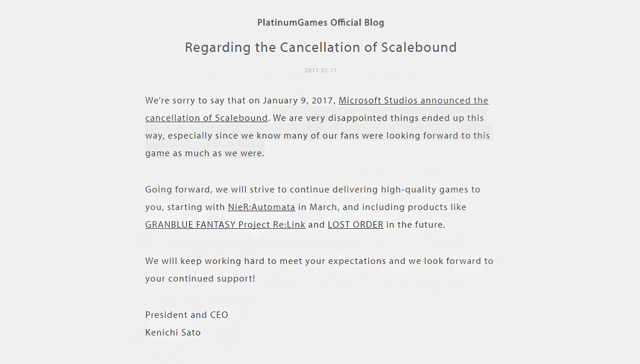 El propio Phil Spencer respondía a un usuario sobre la cancelación de Scalebound, y Platinum Games tampoco ha tardado mucho en dar su respuesta a este desafortunado acontecimiento en su página oficial.