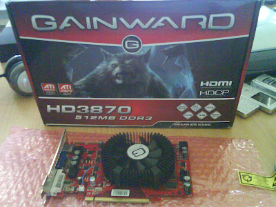 Hoy nos hemos comprado dos tarjetas gráficas nuevas para nuestros PC. Dos Ati Gainward HD 3870, 512Mb GDR3. Una para cada redactor del blog. Así que a partir de ahora puede que veais mas MicroAnálisis de juegos de PC, gracias a ellas…jejeje. Os dejo la foto para que podais comprobar el tamaño considerable de la gráfica. Veremos que tal se portan con un testeo exaustivo de juegos.